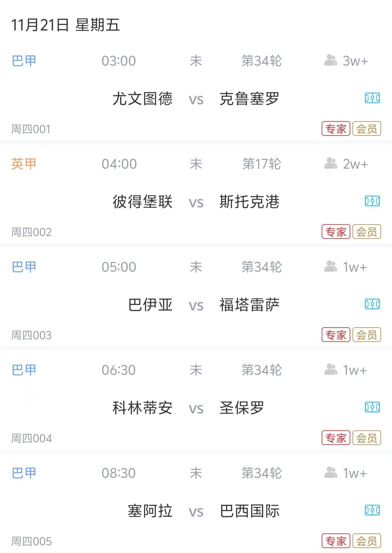 巴伊亚VS福塔雷萨,这场综合各方面来看,算是比较稳的,巴伊亚获胜无忧,比分预测为1比0,2比0,2比1。科林蒂安VS圣保罗,两队都是中国球迷熟悉的,科林蒂安有德佩,圣保罗有奥斯卡,不过这场比赛两人都很难上场。两队目前状态是保级无忧,争前四无望,相对来说,看好科林蒂安不败,比分预测为1比1,2比1,2比2。