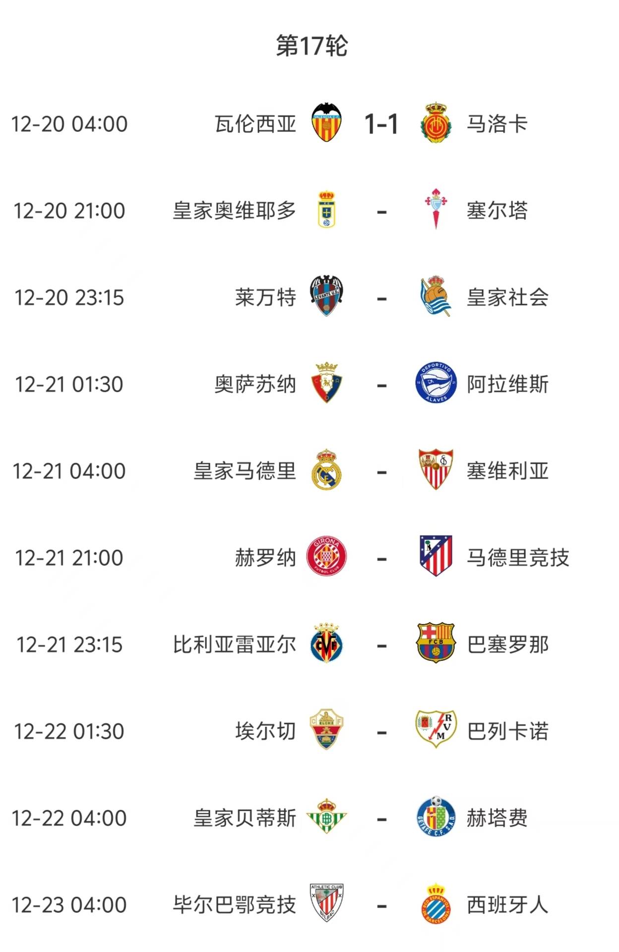 西甲直播,西甲赛程,西甲积分榜,皇马vs巴萨直播,西甲比分预测/为中文用户提供2025赛季西甲联赛全方位资讯:免费高清中文直播入口、赛程表、积分榜更新、皇马与巴萨动态追踪、竞彩推荐与比分预测。昨晚,西甲第17轮先行开打一场,瓦伦西亚主场1比1战平马洛克。需要说明的是,西甲中下游球队对决,基本是小球天下,大部分场次不是让平就是平,让胜或爆冷输的并不多,这点跟德甲和英超是不一样的,有点类似于意甲。