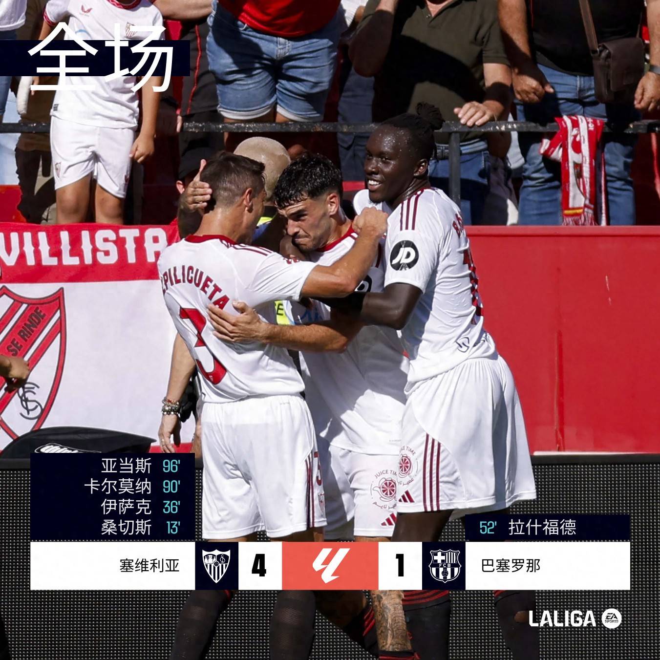 但巴萨的翻盘希望在接下来的几分钟内彻底破灭。巴尔德在左路突破被拉倒,主裁判判给巴萨点球。莱万主罚时试图慢节奏欺骗门将,但由于角度过偏,点球击中立柱,错失了扳平机会。随后,塞维利亚发动快速反击,卡尔莫纳小角度低射破门,3-1!最后,塞维利亚在补时阶段锁定胜局,厄朱克传中,阿尔科-亚当斯破门,最终以4-1大胜巴萨。