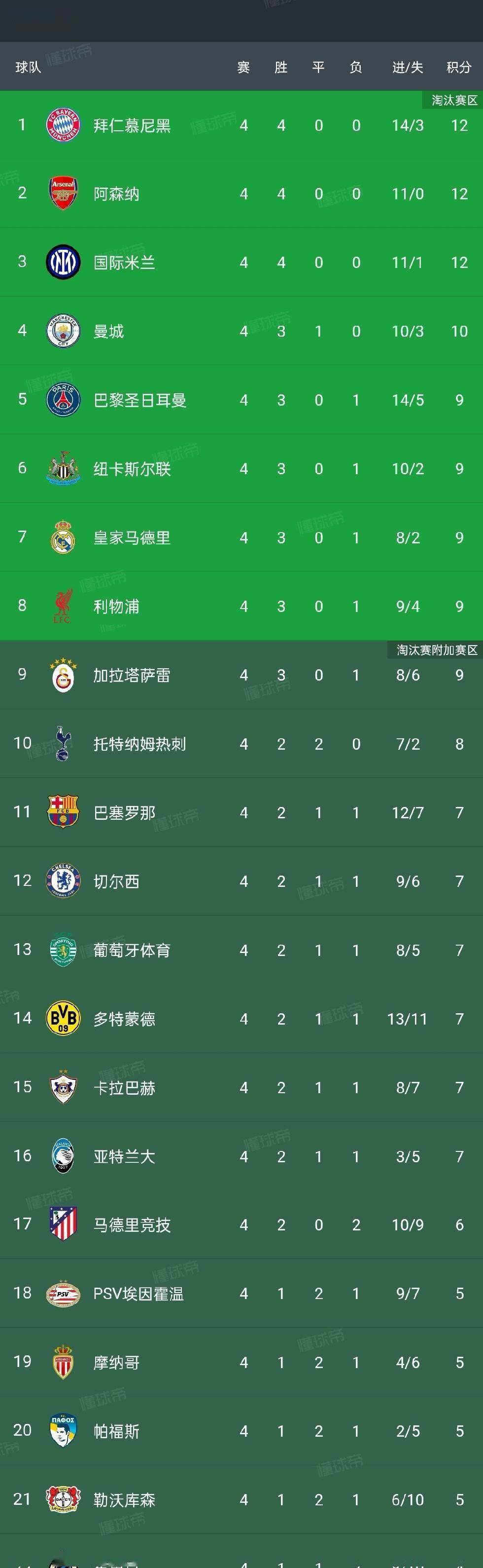 本赛季欧冠联赛阶段的积分榜呈现出全新格局。拜仁慕尼黑、阿森纳和国际米兰成为三大全胜球队,同积12分,因净胜球差异分列前三名。