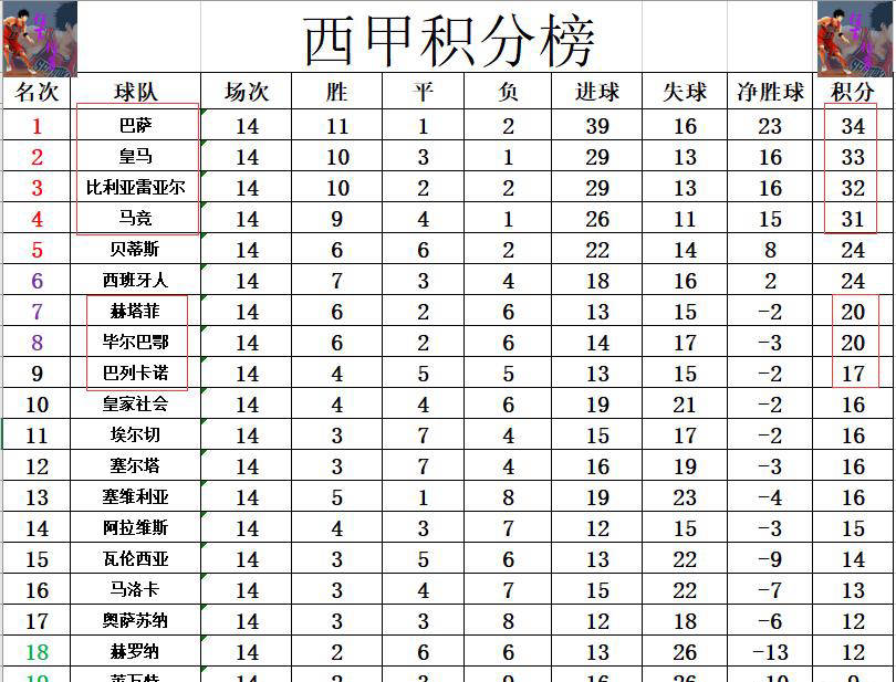 积分榜方面,榜首争夺异常激烈。皇马经历三连平后,从领先巴萨5分到暂时落后1分。紧随其后的是比利亚雷亚尔和马竞,现四队巴塞罗那、皇家马德里、黄潜和马竞以1分微弱差距排居前四。巴列卡诺如今日取胜,本有机会逼近第七、第八位置的赫塔菲和毕尔巴鄂竞技,但因先赢后平,目前仍落后对手3分。
