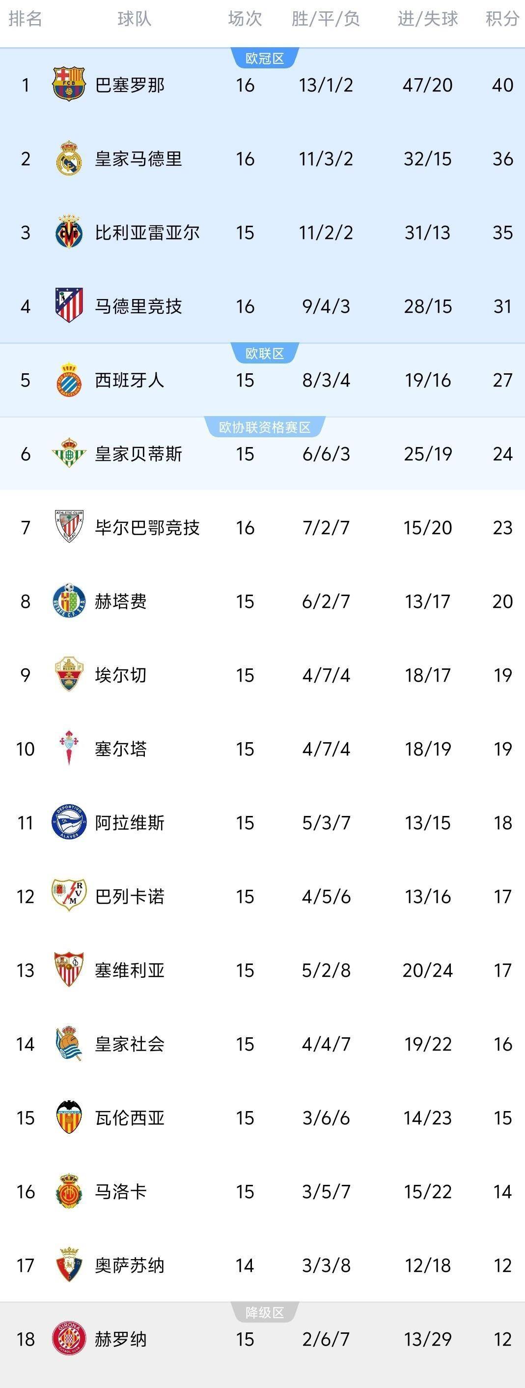 反观巴萨,人家可是稳得一批。我们没细说他们这轮怎么赢的,看看积分榜就明白了,40分,13胜1平2负,进了47个球。从客场输给皇马之后,他们一口气拿了六连胜,抢了18分,直接从落后变成了反超,还把优势扩大到了4分。 这一正一反,差距可不就拉开了吗。