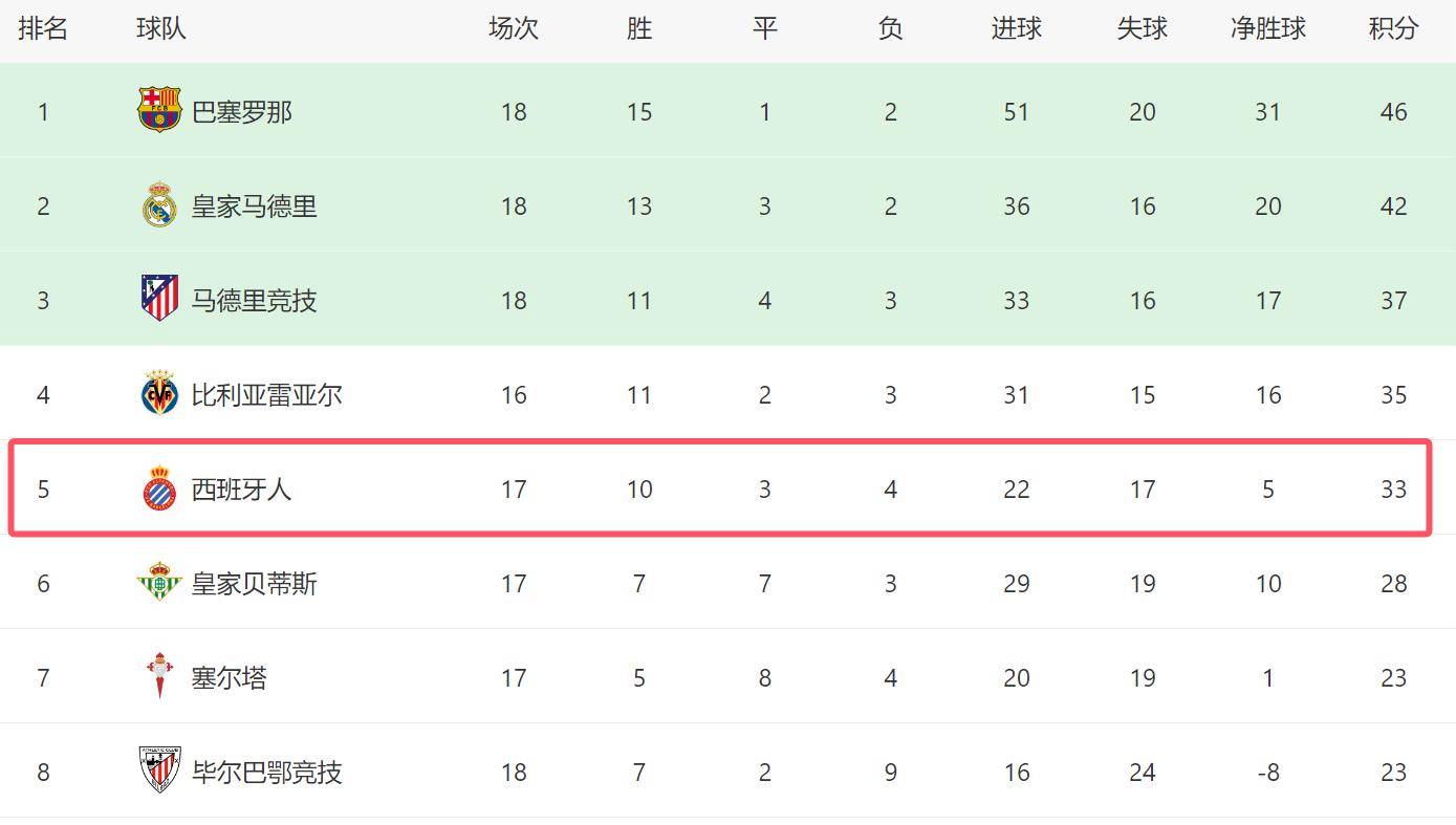 目前,西班牙人在西甲联赛中已经豪取五连胜,成为巴塞罗那之外,近期状态最为火热的球队。积分榜上,他们稳居第五位,距离排名第四的比利亚雷亚尔仅有2分之差,与排名第三的马德里竞技也只有4分的差距。如果能够延续目前的良好状态,西班牙人甚至有望冲击联赛前三。
