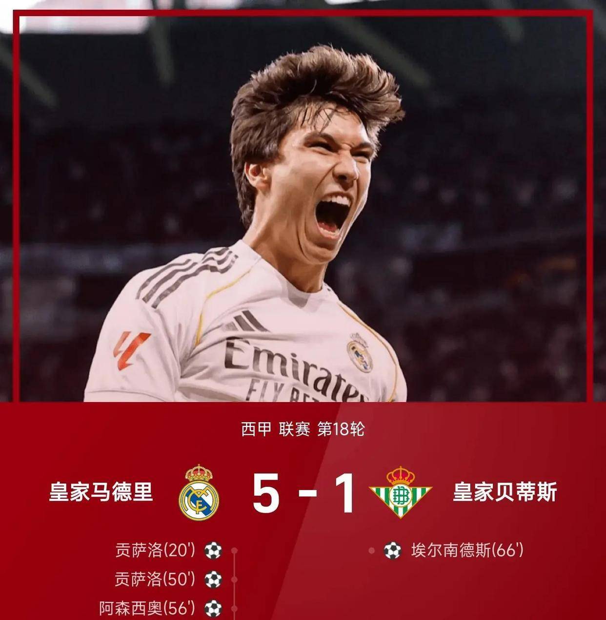 另一边,皇马的比赛完全是另一种剧情。第20分钟,罗德里戈从禁区左侧开出任意球,贡萨洛后点头槌破门,率先亮剑。下半场的第50分钟,巴尔韦德右路传中,贡萨洛用胸部停球,大力抽射轰出第二个进球,如同精准制导的导弹直入球门。