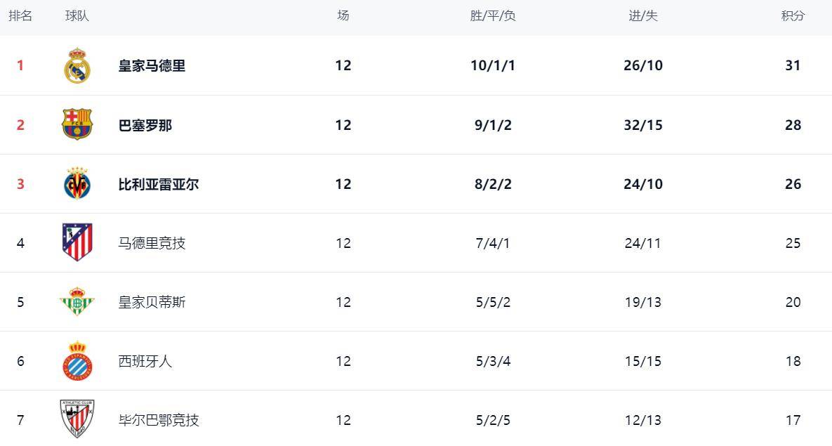 积分榜上,皇家马德里以10胜1平1负积31分的战绩,稳居榜首。巴塞罗那以28分紧随其后,缩小了与皇马的差距。比利亚雷亚尔以26分位列第三,马德里竞技则以25分排名第四。皇家贝蒂斯本轮收获一场平局,以20分位居第五,西班牙人则以18分排名第六。返回搜狐,查看更多