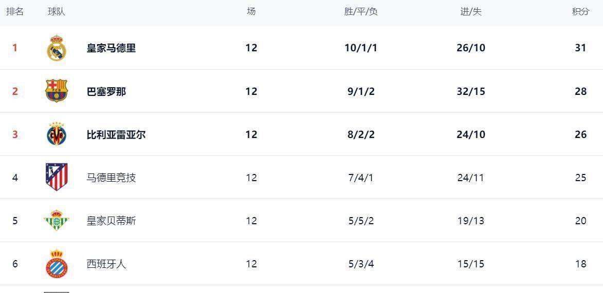 12轮战罢,皇马以10胜1平1负积31分,继续领跑积分榜,但领先优势已经缩小至3分。巴萨以9胜1平2负积28分,紧随其后,卫冕希望重燃。比利亚雷亚尔(26分)与马竞(25分)分列三四位,欧冠资格的争夺愈发激烈。贝蒂斯(20分)、西班牙人(18分)等中游球队的差距也进一步缩小。