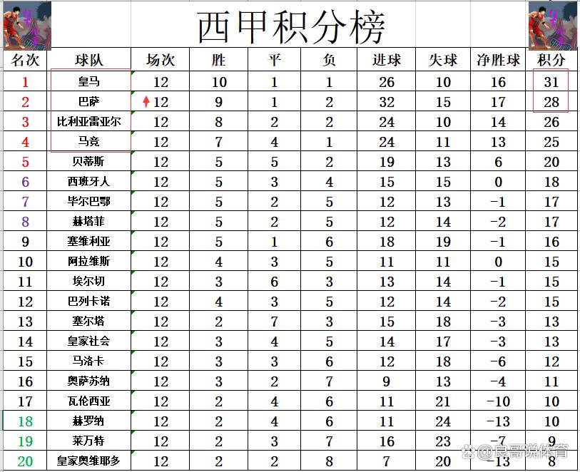本轮比赛过后,皇家马德里虽然被巴列卡诺逼平,但依然占据积分榜榜首的位置。而巴塞罗那战胜塞尔塔后,超越比利亚雷亚尔,重回积分榜第二位,并将与皇马的积分差距缩小到3分。马德里竞技近期状态火热,连战连胜,目前排名第四,与皇马相差6分。
