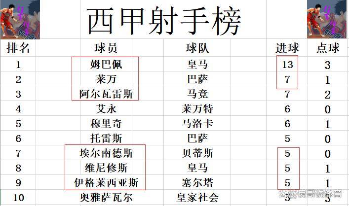 在射手榜方面,姆巴佩以13粒进球遥遥领先。莱万多夫斯基凭借本场比赛的帽子戏法,追平了阿尔瓦雷斯,两人以7粒进球并列第二,但距离姆巴佩仍有6球的差距。艾永和穆里奇以6球并列第四。伊格莱西亚斯本场比赛也收获一球,与埃尔南德斯一道追上了托雷斯和维尼修斯,将射手榜前十的门槛提高到了5球。