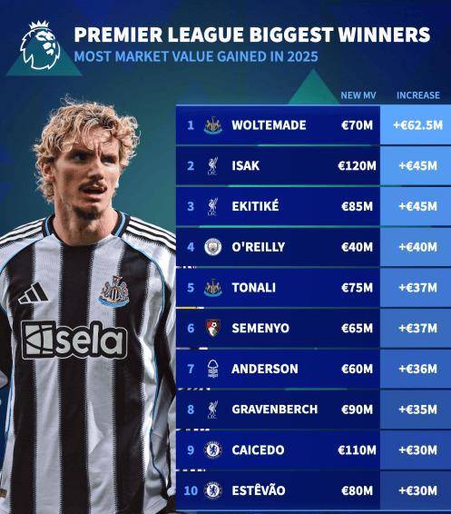 球员身价暴涨现象背后是足球市场的深层变革。 俱乐部转会策略从购买成品球星转向投资潜力新星。 沃尔特马德的案例中,纽卡球探跟踪他超过两年,最终在价值低位时果断出手。