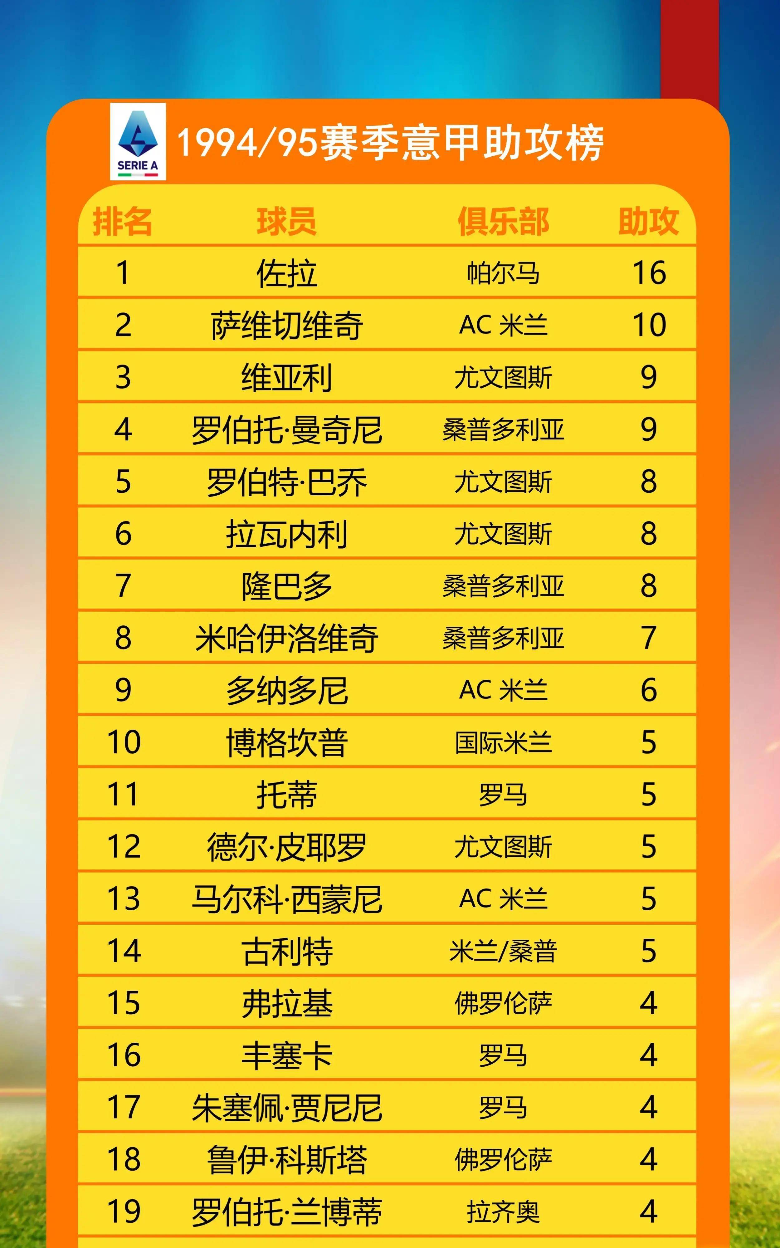 1995年1月第15轮客场比赛,是本赛季的一个高光转折点。尤文图斯在和帕尔马队的关键比赛中实现逆转,从那以后就一直占据联赛榜首,还提前两轮锁定了冠军。米兰王朝的统治在这一年结束了,本赛季意甲有了新的竞争格局。尤文图斯从AC米兰的阴影里走出来,成了新的王者。帕尔马和拉齐奥表现很厉害,让人看到意甲有了多极化趋势。