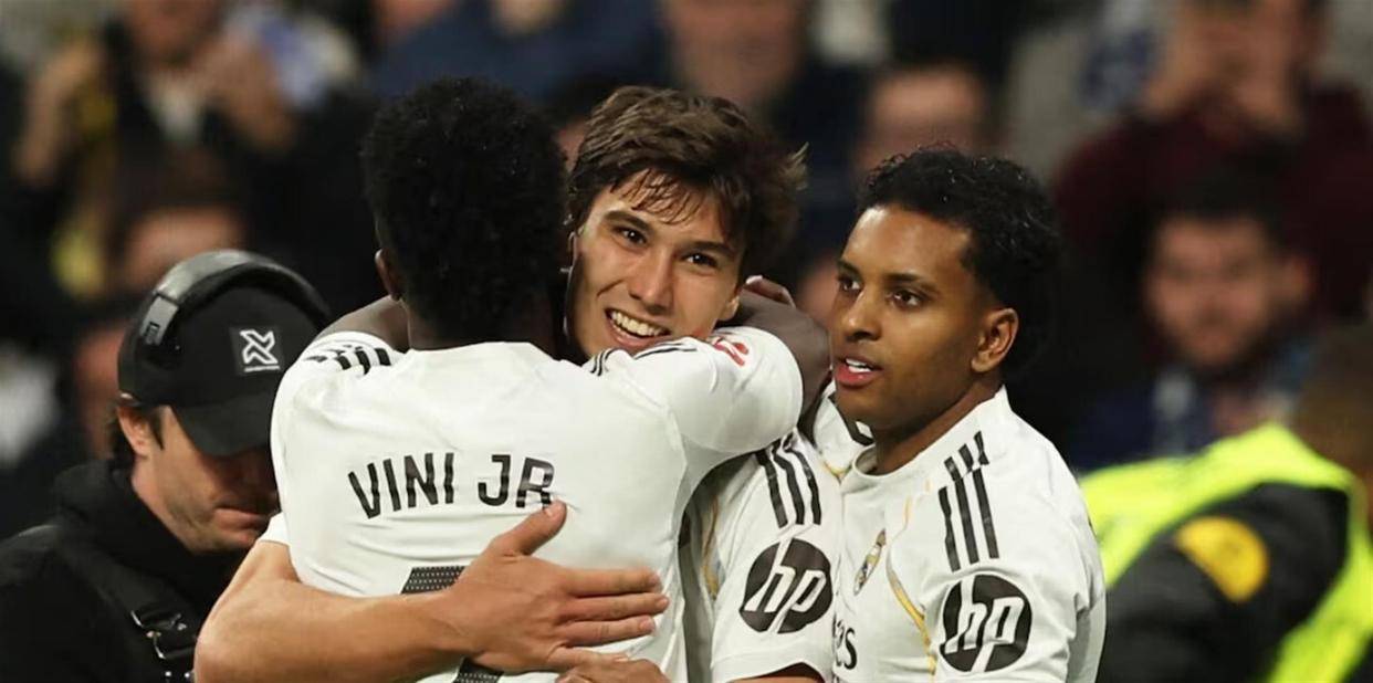 这补时阶段的进球大战还没停。 第45分钟,也就是上半场最后一分钟,皇马获得角球。 罗德里戈把球开到禁区,中后卫赫伊森的头球攻门重重砸在横梁上弹回,拉菲尼亚在门线上把球解围出去,但球没踢远,跟进的贡萨洛·加西亚迎球又是一脚补射,皮球再次击中横梁,这次弹进了网窝! 2比2! 短短六分钟,两队进了三个球,把所有人都看傻了。